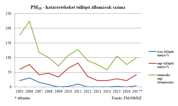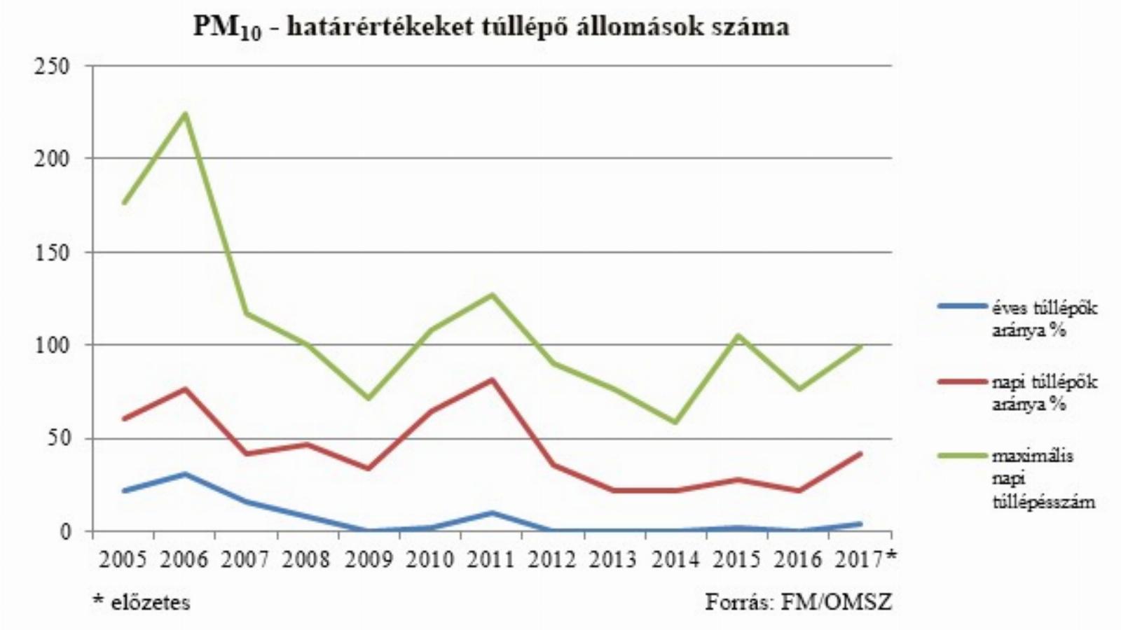Emelkedtek 2017-ben a szállópor- (PM10-)szennyezettségi mutatók – derül ki az illetékes Földművelésügyi Minisztérium (FM) lapunknak küldött adatsorából. Egy évvel korábban akadt olyan nap, amikor közel 80 hazai állomáson mértek határérték-túllépést, addig tavaly ez a szám már mintegy százra ugrott. Az érték az elmúlt évek során hullámzást mutat: 2009-ben, illetve 2012 és 2014 között is álltunk már alacsonyabb szinten. A napi határérték-túllépést mutató mérőállomások aránya is kedvezőtlenül változott: míg az érték az elmúlt évek során 25 százalék körül mozgott, addig tavaly ismét 50 százalék közelébe került.