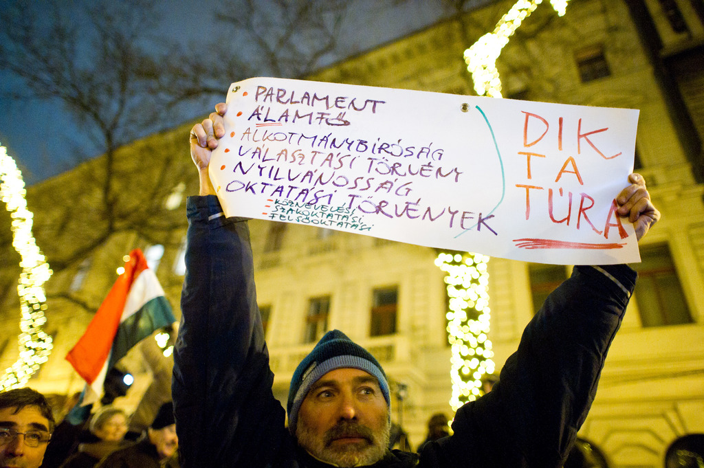 Az Alaptörvény ellen már a hatályba lépése másnapján, 2012. január 2-án is tüntettek az Operaháznál. Fotó: Német András Péter