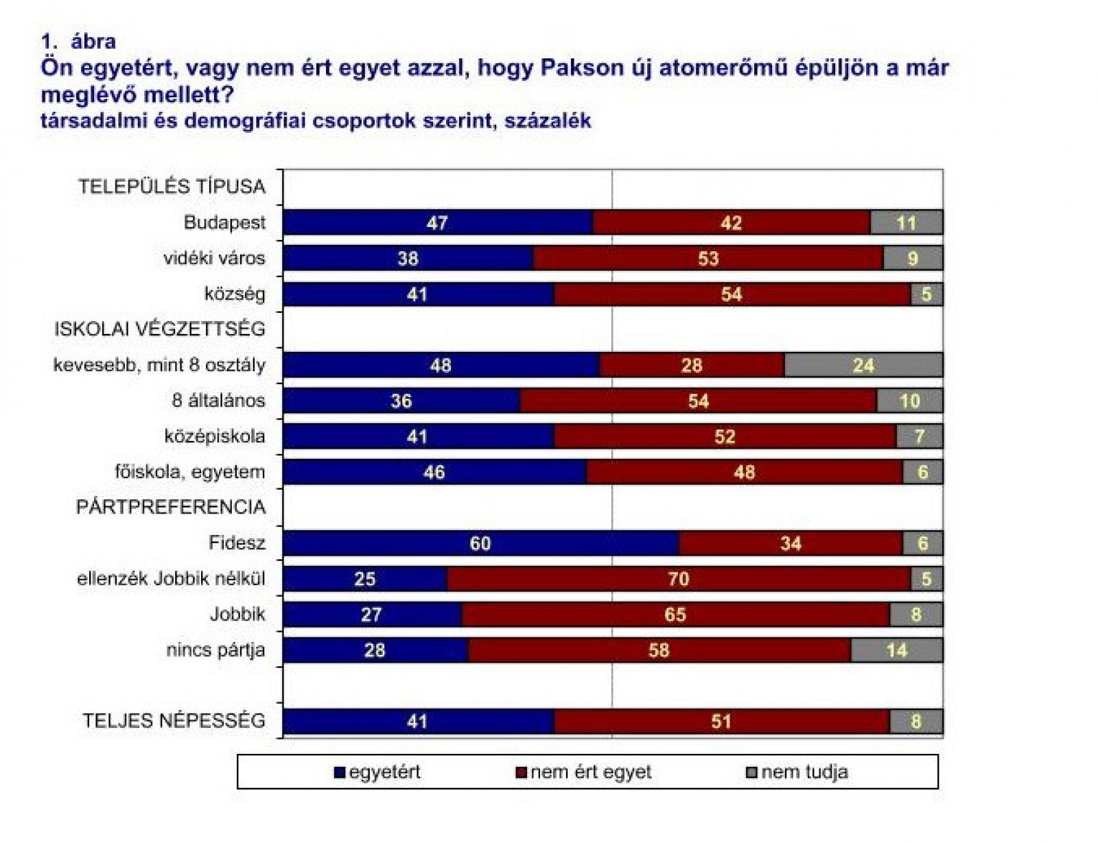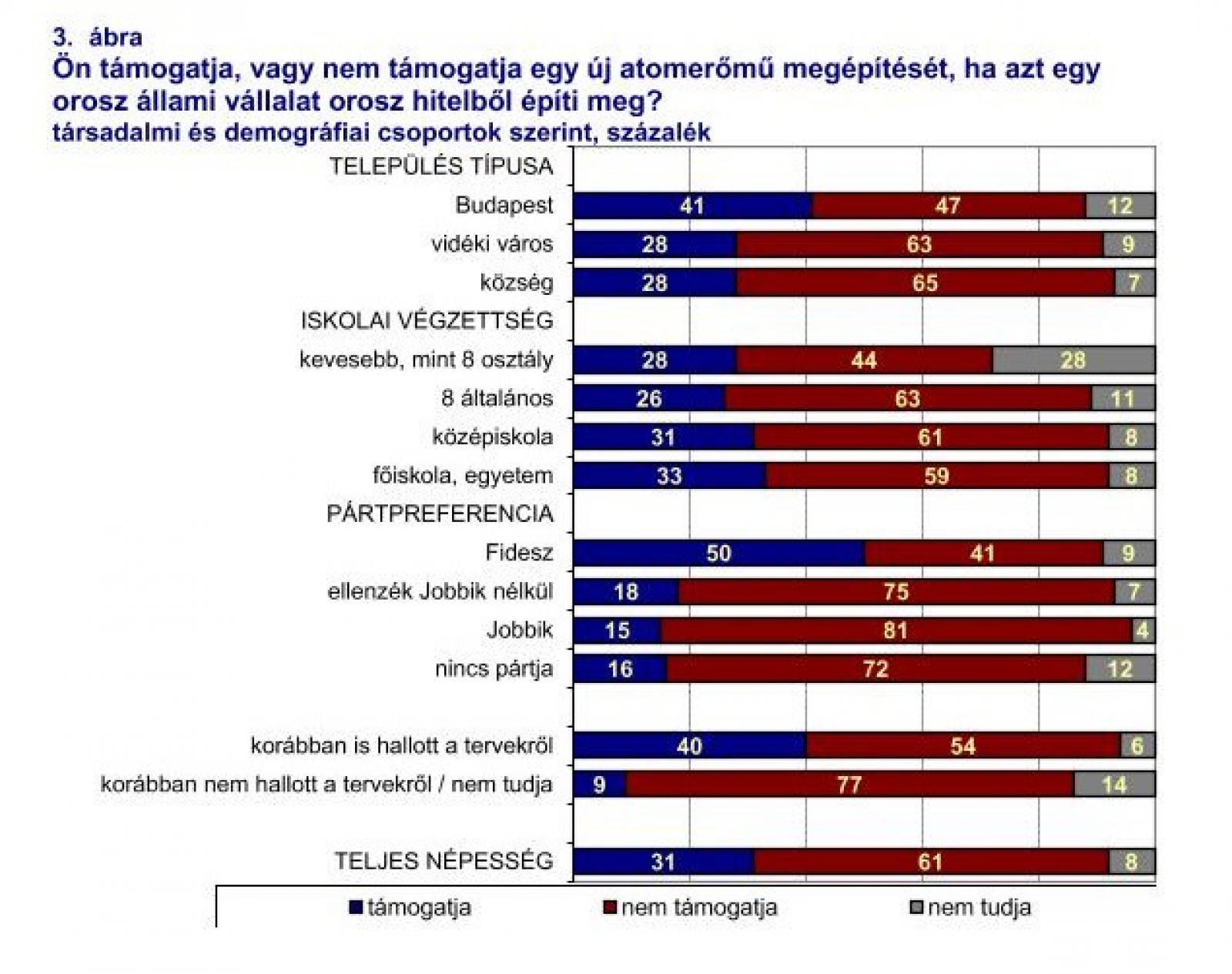 A júniusi adatfelvételű kutatás legfontosabb következtetése, hogy a bővítést általánosságban is csupán a lakosság 41 százaléka támogatja, 51 százaléka pedig elutasítja. A tervnek egyedül a Fidesz-szavazók körében van minimális többsége, minden más társadalmi csoportban az ellenzők vannak többen. Ha pedig úgy teszik föl a kérdést, hogy akarják-e az emberek az orosz kivitelezésű, orosz technológiájú beruházást, már csak 31 százalék a projekt támogatottsága: még a Fidesz-szavazók közül is csak minden második ért egyet vele, az összes többi választói csoportban pedig elsöprő többségben vannak a tervet elutasítók. Az ellenzők aránya éppen abban a vidéki választói rétegben a legerősebb, ahol az ellenzék gyakorlatilag eltűnt az áprilisi választásokon: a vidéki városokban és a községekben csupán a választókorú népesség 28 százaléka támogatja az oroszokkal megvalósított beruházást, míg 63 illetve 65 százalék határozottan ellenzi.