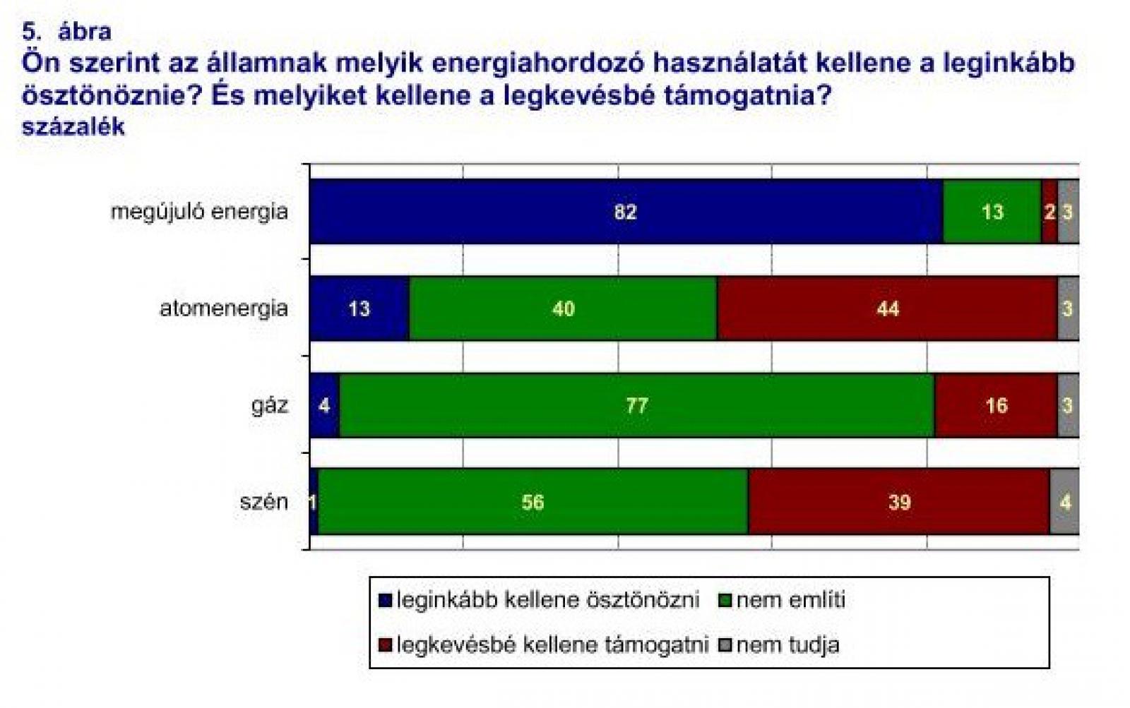 Ennél is egyértelműbb a helyzet, ha az a kérdés, hogy milyen energiapolitikát kellene folytatnia a kormánynak. A megkérdezettek 82 százaléka szerint az államnak az atomenergia helyett a megújuló energiaforrásokat kellene támogatnia. Az atomenergiát csupán 13 százalék tartja támogatandónak, és a fideszes elkötelezettségű szavazók 72 százaléka is inkább a zöldenergiára szavazna.