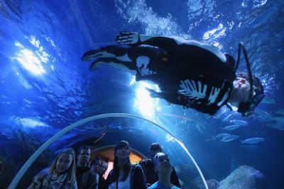 Egy csontváznak öltözött búvár műanyag tökökből eteti a halakat a berlini SeaLife központban.