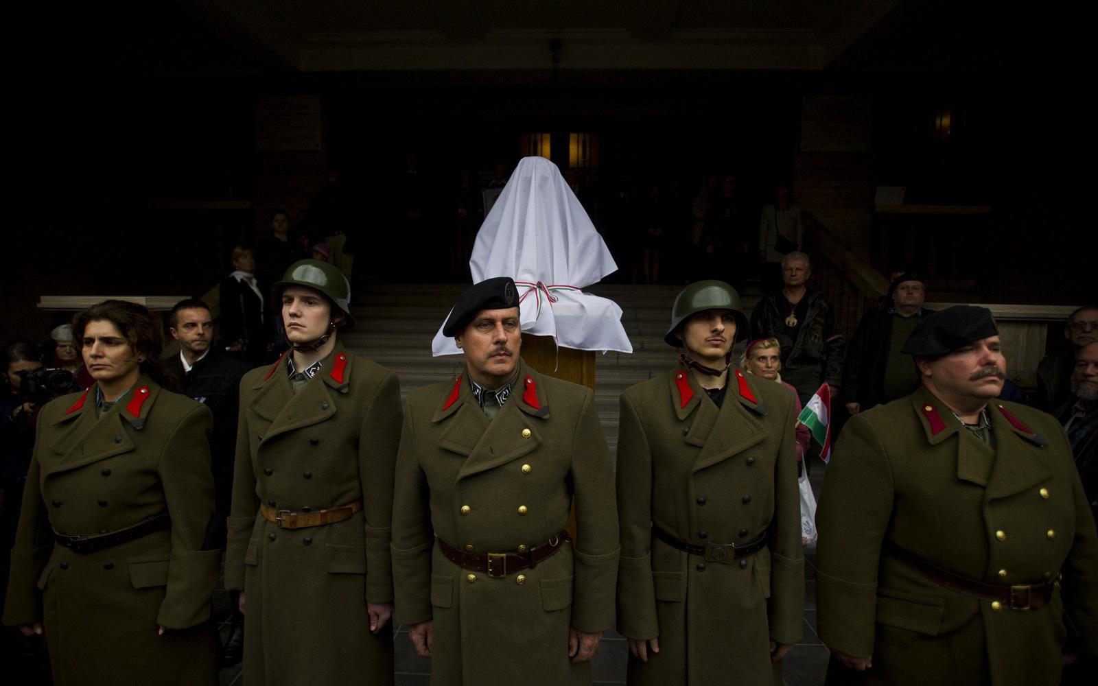 A templomot és annak előterét megtöltötték ugyan a szoboravatásra érkezők - sokan különféle "hagyományőrző" katonai viseletbe, kitüntetésekkel dekorált egyenruhában, illetve a betiltott gárdistákéra emlékeztető öltözékben jelentek meg -, de a templom előtt, a téren már a hangosítás sem tudta elnyomni a tüntetők hangját. A mintegy 800-1000 fős tüntető tömeg - akiket az avatóktól erős rendőrkordon választott el - tagjai közül sokan sárga csillagot viseltek a kabátjukon, így emlékeztetve a Horthy kormányzósága idején hozott zsidótörvényekre illetve a deportálásokra.