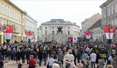 Érezhető volt, hogy közeleg a beszédben a katarzis, és úgy is lett. Még vont egy párhuzamot Orbán emlékeztetve, hogy „nemzeti alkotmányunk” úgy végződik – „Legyen béke, szabadság és egyetértés” - ahogy a 12 pont kezdődik, majd megállapította, hogy olyan időket élünk, amikor a gyengéknek és a gyáváknak nem osztanak lapot, ezért nagyon erősnek és egységesnek kell lennünk. „Az egység neve pedig április 6-a!” – adta ki a jelszót zárásként Orbán. A zenekar tust húzott, az emberek szétszéledtek, az öregasszonyok pedig a következő sarkon a villamoshoz csoszogva már recepteket, konyhai praktikákat osztottak meg egymással.