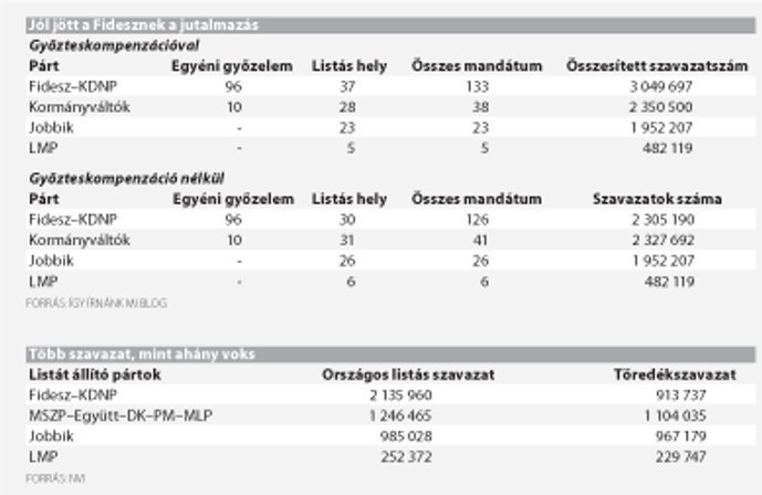 A cikk felidézi, hogy a korábbi rendszerben csak az egyéni választókerületekben vesztes jelöltekre leadott (voltaképpen elveszett) szavazatokat számították be töredékszavazatként úgy, hogy az országos listán végül mandátumot érhettek. Ezzel szemben az új törvény szerint az első és második helyezett egyéni jelöltekre leadott szavazatok különbsége is töredékszavazatnak minősül. Ha tehát egy választókerületben a Fidesz jelöltje 10 ezer, a baloldali jelölt pedig 8 ezer szavazatot kapott, a Fidesz országos listájára is felkerül 1999 töredékszavazat. Mindez azt is jelenti, hogy míg a vasárnapi eredmények nyomán a jelenlegi állás szerint 133 képviselői helyre számíthat a Fidesz-KDNP, addig a győzteseknek járó töredékszavazatok nélkül csupán 126 helyük lenne, tehát távol állnának a kétharmados többségtől.