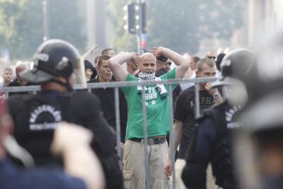 A helyszínre a kiabálásokat követően néhány perccel több rendőrautót vezényeltek. Az érpataki polgármester a szervezőkkel tárgyalt, azt mondta, hogy politikai szabadságjoga bejutni a felvonulásra. A csoportot végül nem engedték be a lezárt területre, sőt a rendőrök az egész bejáratot lezárták. A kordonon kívül, szintén a Kálmán Imre utcánál egy fekete ruhát viselő csoport szintén szidalmazni kezdte a Pride-felvonulásra érkezőket, a többségében kapucnis férfiak petárdákat is robbantottak. A Hold utca és a Kálmán Imre utca kereszteződését ekkor a rendőrség körbezárta, a mintegy 40-50 fekete ruhást igazoltatták.