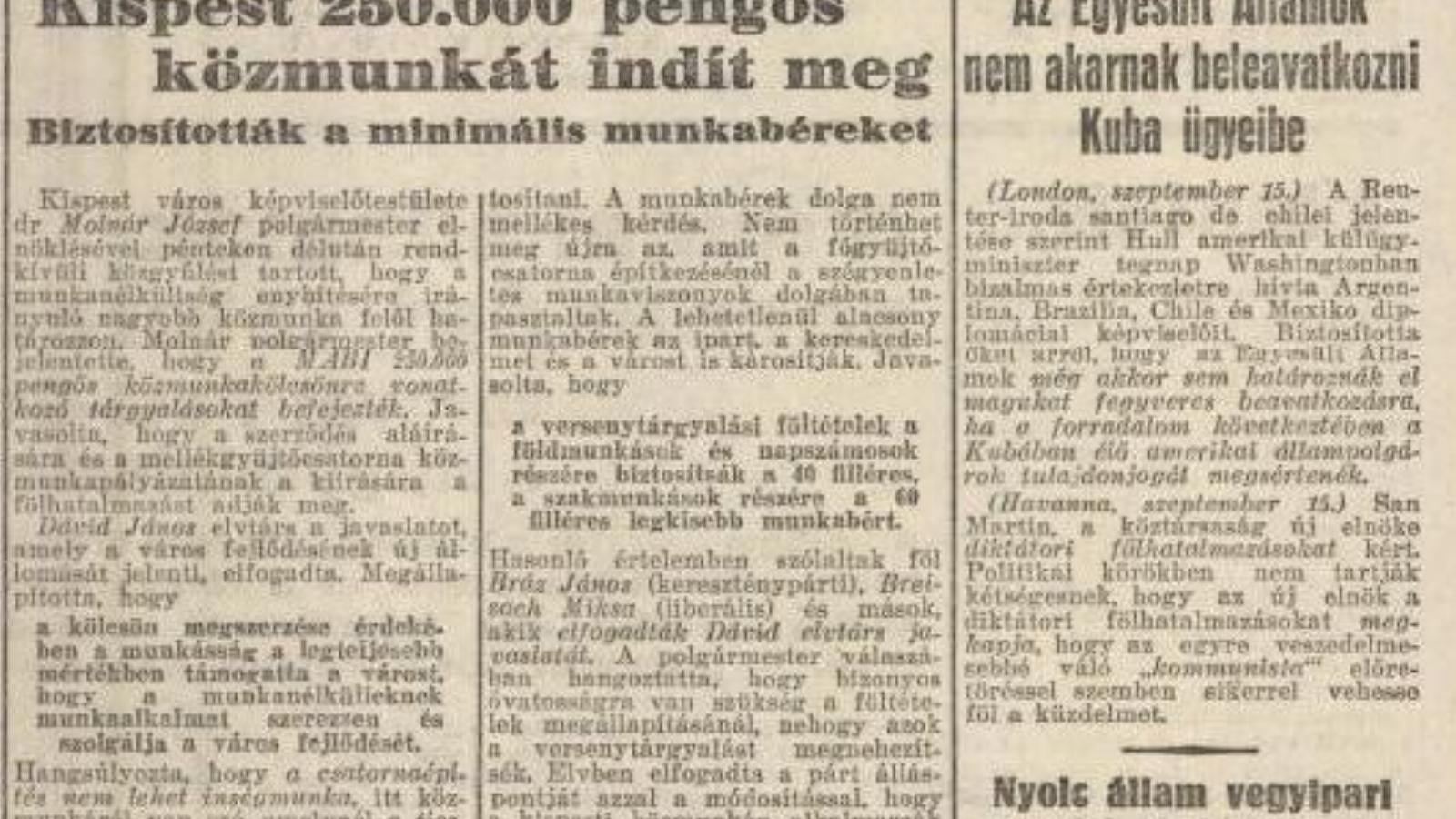 Kispest város képviselőtestülete dr. Molnár József polgármester elnöklésével pénteken délután rendkívüli közgyűlést tartott, hogy a munkanélküliség enyhítésére irányuló nagyobb közmunka felől határozzon. Molnár polgármester bejelentette, hogy a MABI 250.000 pengős közmunkakölcsönre vonatkozó tárgyalásokat befejezték. Javasolta, hogy a szerződés aláírására és a mellékgyűjtőcsatorna közmunkapályázatának a kiírására a fölhatalmazást adják meg.