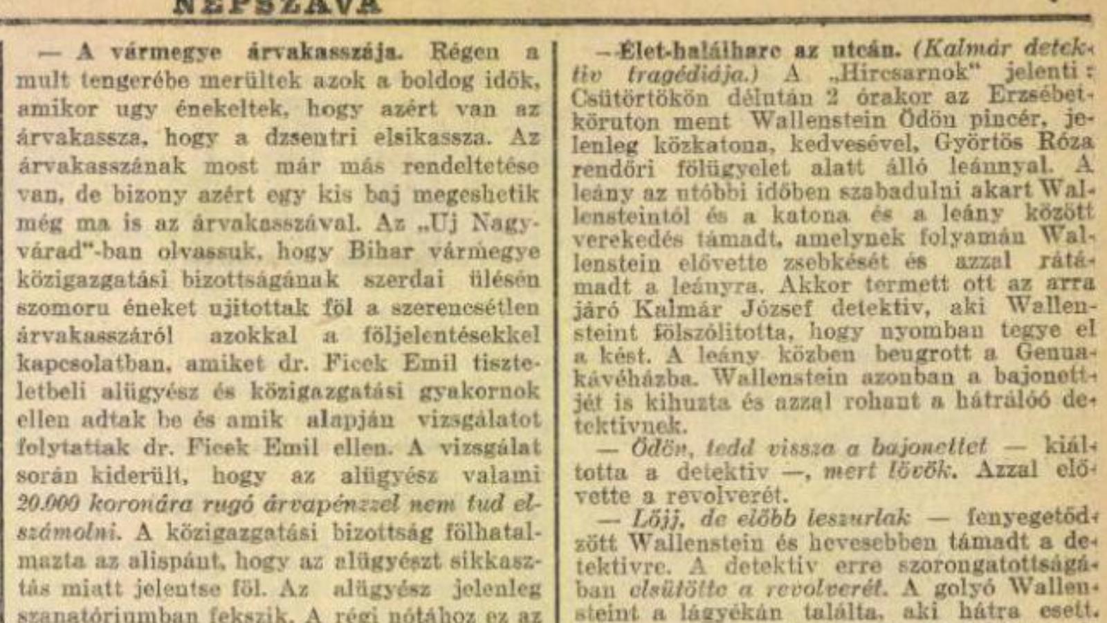 A „Hírcsarnok" jelenti: Csütörtökön délután 2 órakor az Erzsébet-körúton ment Wallenstein Ödön pincér, jelenleg közkatona, kedvesével, Györtös Róza rendőri fölügyelet alatt álló leánnyal. A leány az utóbbi időben szabadulni akart Wallensteintől és a katona és a leány között verekedés támadt, amelynek folyamán Wallenstein elővette zsebkését és azzal rátámadt a leányra. Akkor termett ott az arra járó Kalmár József detektív, aki Wallensteint fölszólította, hogy nyomban tegye el a kést. A leány közben beugrott a Genua kávéházba. Wallenstein azonban a bajonettjét is kihúzta és azzal rohant a hátráló detektívnek.