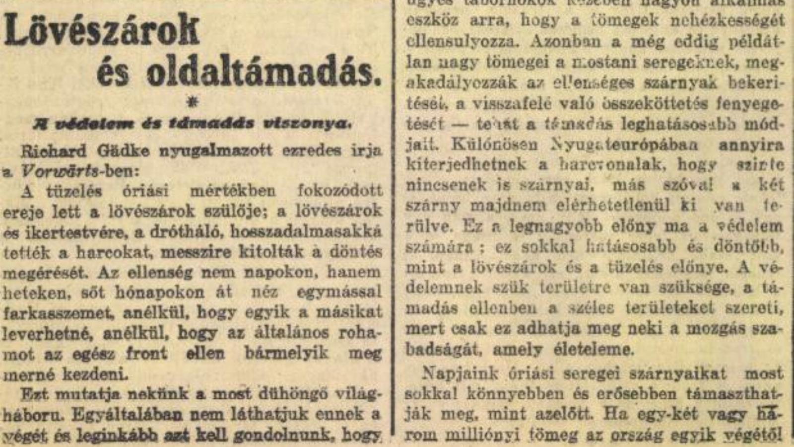 Ezt mutatja nekünk a most dühöngő világháború. Egyáltalában nem láthatjuk ennek a véget és leginkább azt kell gondolnunk, hogy nem lehet, más befejezése, mint az általános kimerülés. Elég baj lenne, ha ez így volna, ha a védelem valóban ennyire erősebb volna a támadásnál. Akkor az éhség és a nyomor tudnák csak az öldöklést befejezni.
