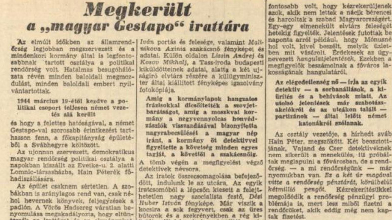 Az osztály vezetője, a hírhedt sváb Hain Péter, megszökött. Két beosztottjának, Vajand és Cser detektíveknek nem sikerült a menekülés, itt próbáltak meglapulni a fővárosban, de a rendőrség. — a mi rendőrségünk — már nyomukban van. Ez a két úr magával vitte a rendőrség pénztárát, körülbelül kétmillió pengőt. Kézrekerítésükkel megoldódik a rendőrség pénzügyi problémája is, mert lesz miből fizetni a rendőröket, akik eddig még nem kaptak fizetést.