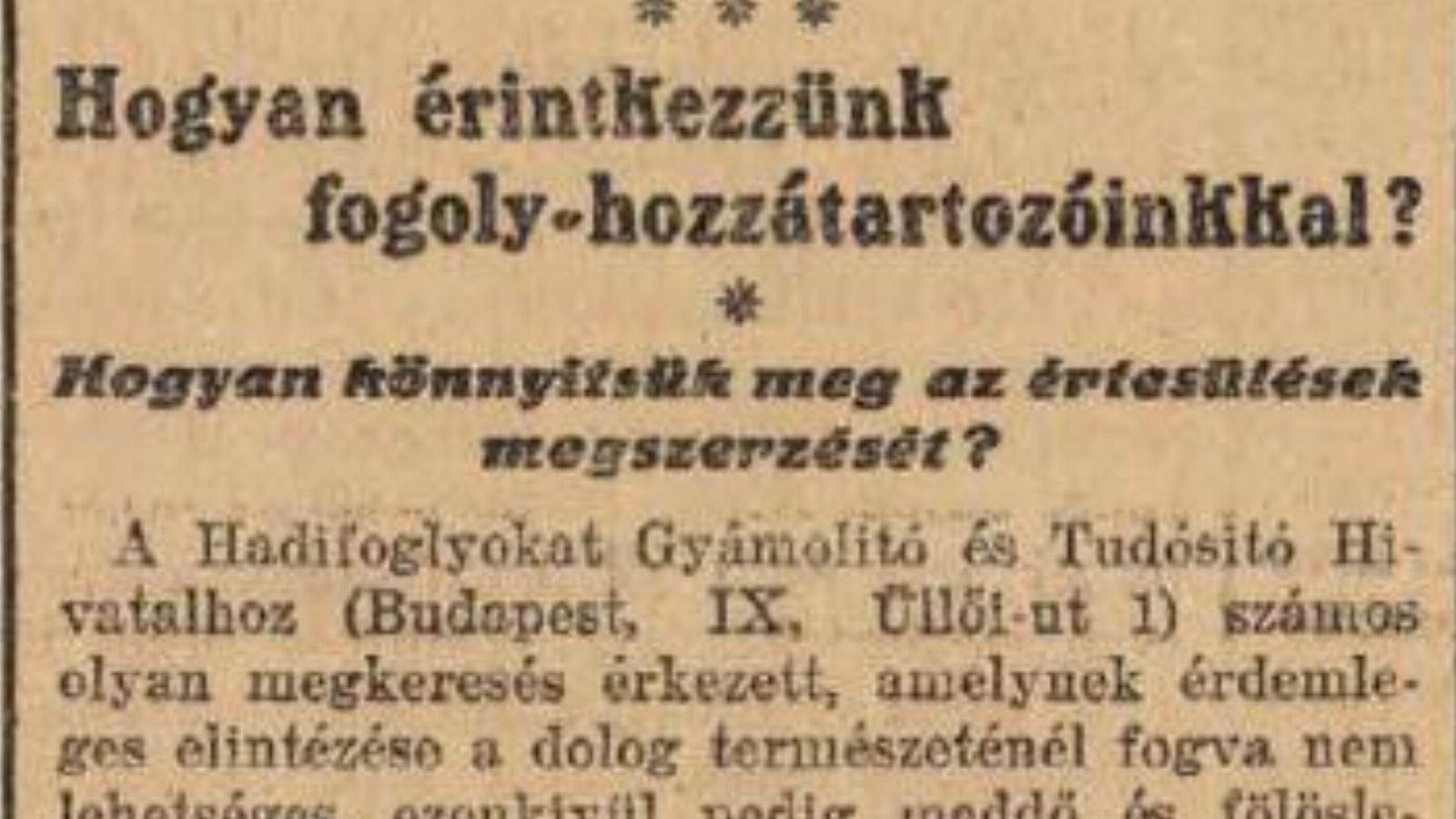 nyilvántart és ha egyik vagy másik felől megkapja a hivatalos értesítést, hogy hadifogságba jutott, erről az illető érdeklődőt haladéktalanul értesíti. Az tehát, akit a hivatal értesít, hogy eltűnt hozzátartozójának hollétének megállapítása iránt a kutatást megkezdte, kapta légyen ezt az értesítést akár személyesen történt bejelentése alkalmával szóbelileg, akár pedig írásbelileg, az újabb választ a hivataltól ne kérjen és ne is várjon; mert ha az illető felől hivatalos értesítés érkezik, ezt a hivatal minden sürgetés nélkül is, még pedig azonnal közli a hadifogoly hozzátartozóival.