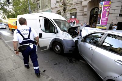 Összeütközött két személyautó a XI. kerületi Bartók Béla úton. Szentendrén motorkerékpár és személyautó karambolozott, a 11-es úton teljes útzár mellett helyszíneltek.