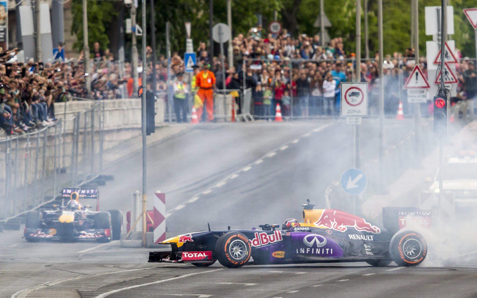 Az autó- és motorsport parádé fél háromkor startolt el, először egy 2012-es Forma-1-es Ferrarival Kimi Räikkönen, az olasz istálló 2007-ben világbajnok finn pilótája száguldozott Budapest utcáin a Lánchíd és az Erzsébet-híd között kialakított pályán, ahol aztán a Red Bull F1-es csapata tartott bemutatót, az autók volánjánál az orosz Danyiil Kvjat és a már visszavonult skót David Coulthard ült.