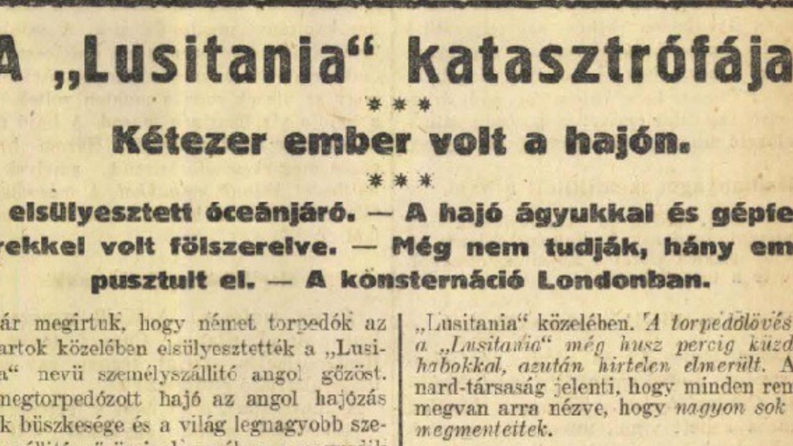 (Amsterdam, május 8.) A Cunard Line igazgatósága megerősíti a „Lusitania" katasztrófájáról érkezett első híreket. A nagy Cunard-gőzöst, amely utóbb Liverpool és Newyork között bonyolította le a személyforgalmat, nyolc tengeri mérföldnyire Caap Old Head of Kensale-tól német tengeralattjáró támadta meg. Eddig még nem derült ki, vajon a „Lusitania" használta-e ágyúit, mielőtt a német búvárhajó rálanszírozta torpedóját.