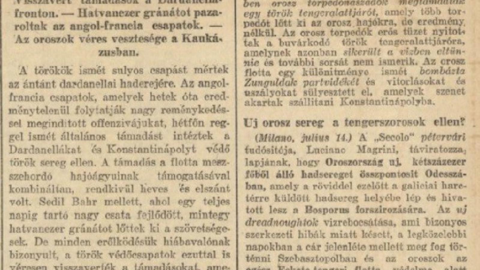 Az angol-francia csapatok, amelyek hetek óta eredménytelenül folytatják nagy reménykedéssel megindított offenzívájukat, hétfőn reggel ismét általános támadást intéztek a Dardanellákat és Konstantinápolyt védő török sereg ellen. A támadás a flotta messzehordó hajóágyúinak támogatásával kombináltan, rendkívül heves és elszánt volt. Sedil Bahr mellett, ahol egy teljes napig tartó nagy csata fejlődött, mintegy hatvanezer gránátot lőttek ki a szövetségesek. De minden erőlködésük hiábavalónak bizonyult, a török védőcsapatok ezúttal Is véresen visszaverték a támadásokat, amelyek a szövetséges csapatok rengeteg veszteségével jártak. Az angol-francia offenzíva legújabb eredménye tehát az, hogy az ántánt újabb nagy kudarcot jegyezhet föl a háború történetének véres lapjaira.