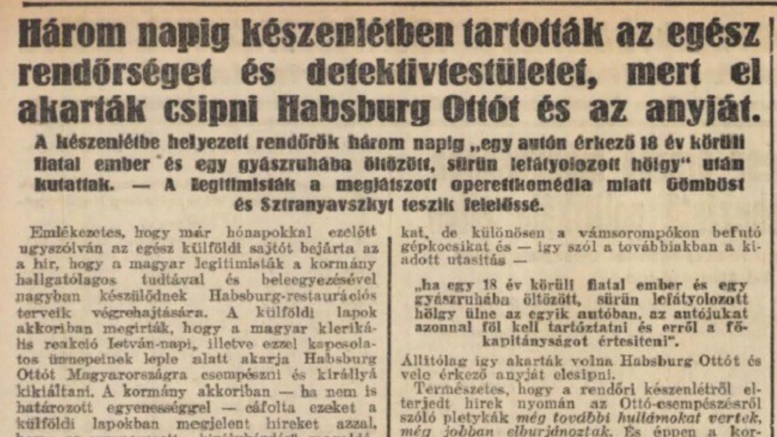 Emlékezetes, hogy már hónapokkal ezelőtt úgyszólván az egész külföldi sajtót bejárta az a hír, hogy a magyar legitimisták a kormány hallgatólagos tudtával és beleegyezésével nagyban készülődnek Habsburg-restaurációs terveik végrehajtására. A külföldi lapok akkoriban megírták, hogy a magyar klerikális reakció István-napi, illetve ezzel kapcsolatos ünnepeinek leple alatt akarja Habsburg Ottót Magyarországra csempészni és királlyá kikiáltani. A kormány akkoriban — ha nem is határozott egyenességgel — cáfolta ezeket a külföldi lapokban megjelent híreket azzal, hogy az úgynevezett „királykérdés" megoldására még nem látja elég érettnek a helyzetet, nem látja elérkezettnek az időt.