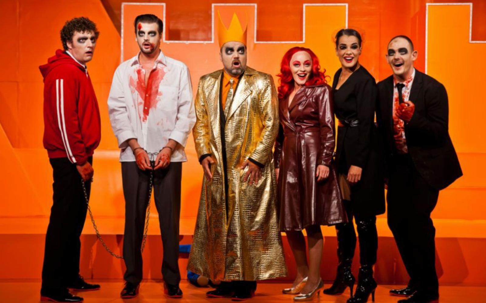 Csak Shakespeare alakjaival ellentétben, itt már nincsenek nagyformátumú hősök, szinte mindenki kisszerű, pitiáner, de nagyra vágyik, és ez az ellentét totálisan röhejessé teszi. Ezért kellene végig nevetnünk az előadást, de úgy, hogy közben összeszorul vagy émelyeg a gyomrunk, netán a hányinger kerülget bennünket, nem a sok színpadi álvértől, hanem a temérdek emberi gusztustalanságtól. A király inge is narancssárga, ez nekem kicsit szájbarágós, és persze, hogy szolgál Orbán paródiával is, Hevér Gábor megszemélyesítésében, aki ezt jól csinálja.