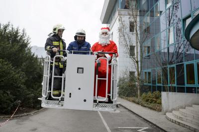 Emelőkosárban érkezett a tűzoltó Mikulás a Szent Lázár Megyei Kórház gyermekosztályára, hogy jobb kedvre derítse a kis ápoltakat. Fotó: Komka Péter/MTI