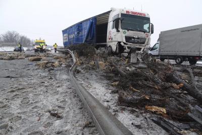 A kamion egy személyautóval ütközött az autópályán Kecskemétnél. A teherautó az ónos esőben megcsúszott, pótkocsija keresztbe fordult és a jármű a szalagkorlátot tíz méter hosszan letarolta, majd a forgalommal szemben megállt. A balesetben senki sem sérült meg.