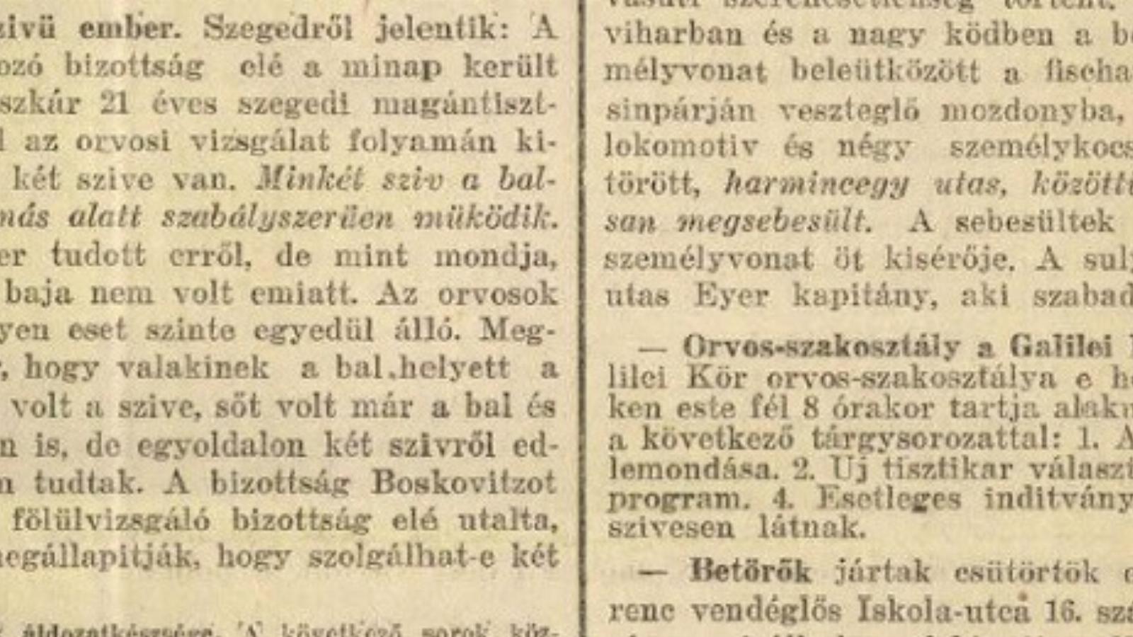 Szegedről jelentik: A szegedi sorozóbizottság elé került a minap került Boskovitz Oszkár 21 éves szegedi magántisztviselő, akiről az orvosi vizsgálat folyamán kiderült, hogy két szíve van.