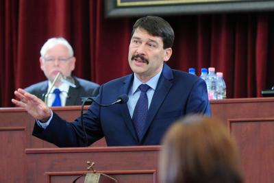 Szakács László, az MSZP országgyűlési képviselője beszél a tüntetésen. MTI Fotó: Bruzák Noémi