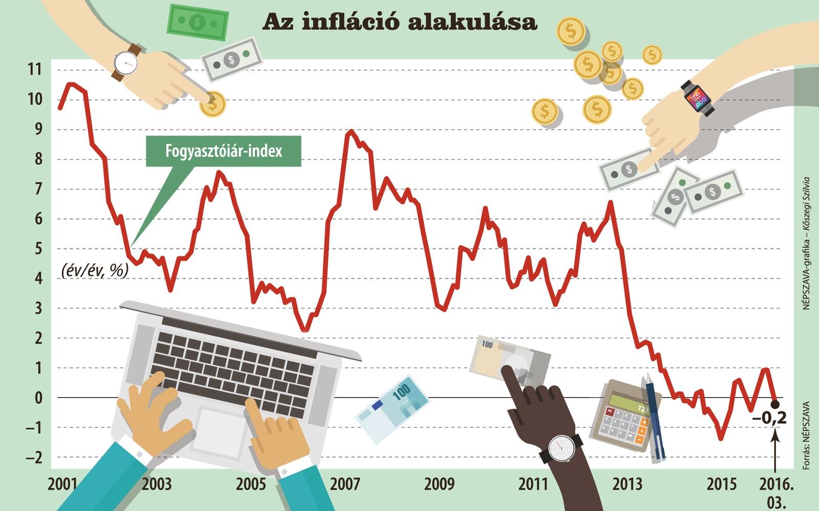 Márciusban a fogyasztói árak átlagosan 0,2 százalékkal alacsonyabbak voltak, mint egy évvel korábban. Az elemzők körében végzett felmérés alapján a szakma 0,1 százalékos eredményt várt a pozitív tartományban, így alaposan meglepte őket a KSH pénteki közlése. Miután az elmúlt négy esztendőben mind a kormány, mind a jegybank, mind az elemzők alaposan elvétik inflációs prognózisukat - a költségvetés 2016-ra 1,6 százalékos pénzromlási ütemmel számolt -, felvetődik a kérdés, mi okozza a tetemes hibaszázalékot egy olyan időszakban, amikor sem a világgazdaságban, sem Magyarországon kiszámíthatatlan fordulat nem következett be. A kőolaj világpiaci árának mélyrepülése - elhanyagolható ingadozások közepette - már egy esztendeje tart. Az kétségtelen tény, hogy az MNB március végi inflációs jelentésében már úgy szólt, hogy "rövid távú előrejelzésünk alapján a december óta bekövetkezett nyersanyag-ár-csökkenés következtében a tavaszi hónapokban ismét negatív tartományba kerül a fogyasztói árak éves növekedési üteme." A jegybank stábja úgy látja, hogy a kormányzati intézkedések közvetlen inflációs hatása továbbra is visszafogott marad. A sertéshús áfájának év eleji csökkentése a fogyasztói árindex enyhe esését eredményezte. Az MNB-nél azt feltételezik, hogy a szabályozott energiaárak belátható időn belül nem változnak.