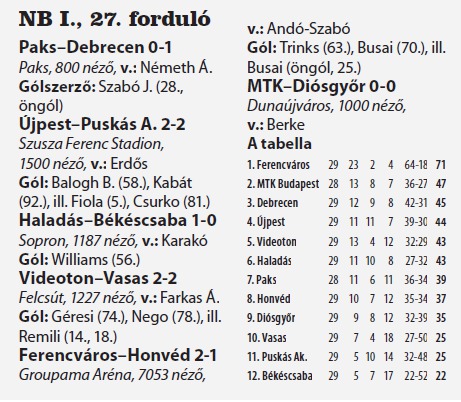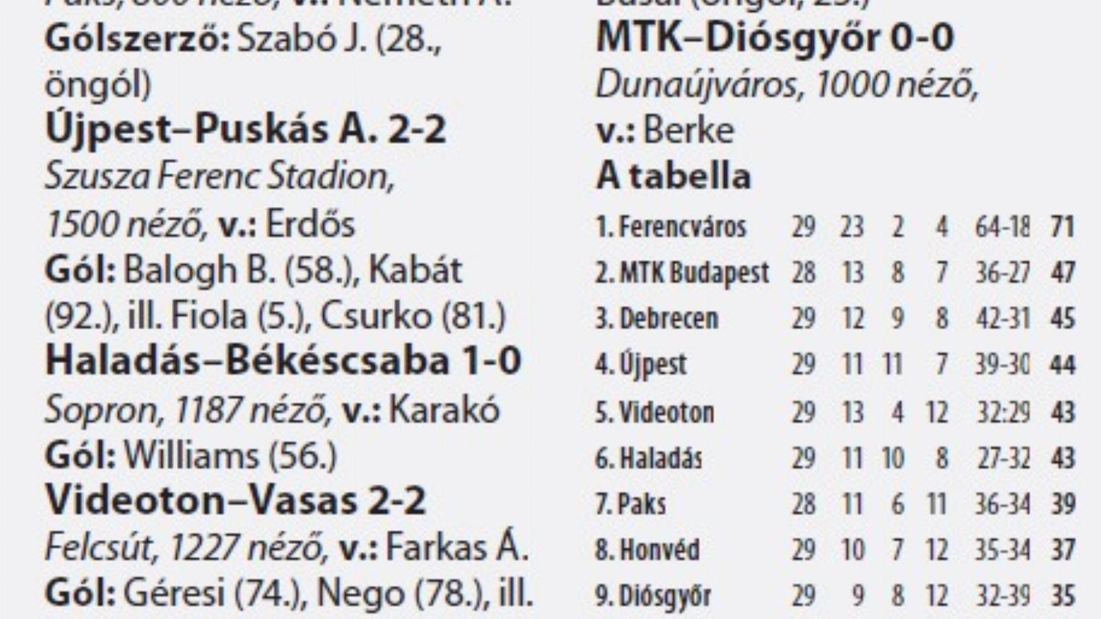 Nem lehet nem észrevenni, mennyire gyatra az NB I első felébe tartozók formája, egyetlen csapat sincs, amely kiegyensúlyozott formát mutatna. Az MTK annak ellenére megtartotta a második helyét, hogy 0-0-t játszott a Diósgyőrrel. A fordulónak az Újpest futott neki a harmadik pozícióból, ám, ha nem Kabát Péteré a slusszpoén, vereséget szenvedett volna a Puskás Akadémiától. Az elnyűhetetlen csatár 722 nap után szerzett ismét gólt az élvonalban. A DVSC három vereséget is szenvedett az utóbbi hetekben, ám szombaton győzött Pakson, és ezzel már harmadik, betudhatóan a Videoton katasztrofális formájának. A címvédő középcsapattá silányult, ezúttal a Vasas ellen kellett örülnie a 2-2-es eredménynek, tudniillik az angyalföldiek már két találattal is vezettek…