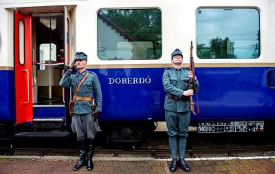 Hagyományőrző katonák az Isonzó Expressz különvonat új, Doberdó nevű kocsija előtt a budapesti Vasúttörténeti Parkban tartott avatóünnepségen 2016. május 2-án. A kibővült különvonat júliusban ötnapos körutazásra indul az első világháború centenáriuma alkalmából az isonzói, doberdói emlékhelyekre.