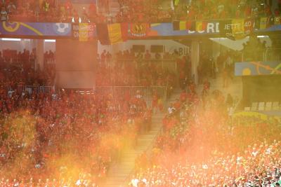 A szögletzászlónál helyet foglaló magyar szurkoló áttörte a szektorok közötti kordonokat és a biztonságiak figyelmeztetése ellenére átsétált a fekete pólóban szurkoló B-középhez a kapu mögé. A biztonságiak próbáltak rendet tenni, de a drukkerek fölénye miatt több szurkolónak is engedték, hogy átmásszanak a kordonon.