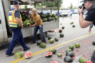 Teherautókról dobáltak dinnyét a termelők a budaörsi Tesco épülete elé szerdán, hogy ezzel is tiltakozzanak az áruházlánc árpolitikája ellen, feltételezve, hogy a Tesco túlzottan alacsony akciós árai lenyomják a felvásárlási árakat. A Tesco azonban hangsúlyozta, hogy az akcióban a már korábban felvásárolt túlkészletet értékesíti néhány áruház, és a cégnek nem célja az árak lenyomása.