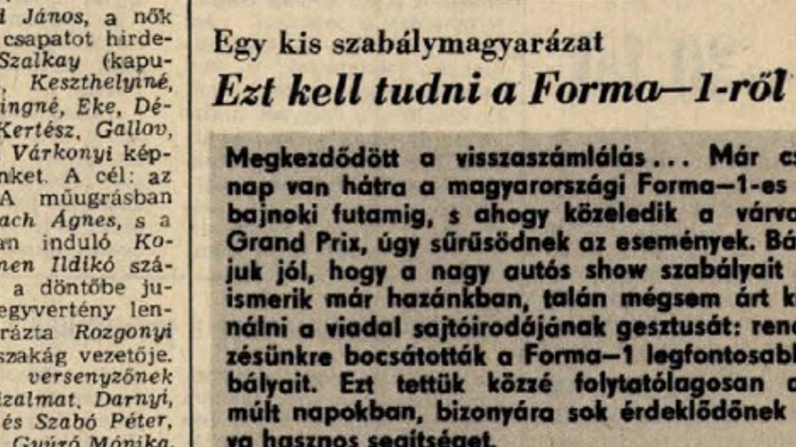 Megkezdődött a visszaszámlálás ... Már csak 4 nap van hátra a magyarországi Forma—1-es világ- bajnoki futamig, $ ahogy közeledik a várva várt Grand Prii, úgy sűrűsödnek az események. Bár tudjuk jól, hogy a nagy autós show szabályait sokan ismerik már hazánkban, talán mégsem árt kihasználni a viadal sajtóirodájának gesztusát: rendelkezésünkre bocsátották a Forma—1 legfontosabb szabályait. Ezt tettük közzé folytatólagosan az elmúlt napokban, bizonyára sok érdeklődőnek nyújtva hasznos segítséget.