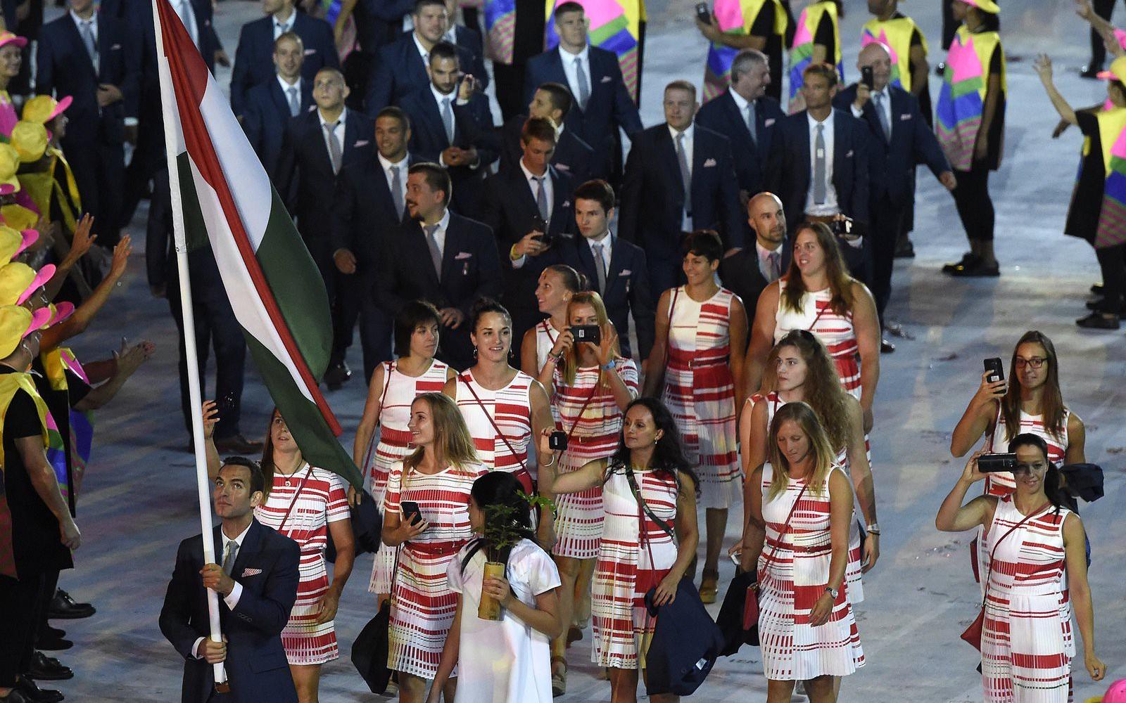 A magyarok Szilágyi Áron vezetésével közép-európai idő szerint 3 óra előtt vonultak be a Maracana Stadionba. A küldöttség élén a piros-fehér-zöld zászlót a négy évvel ezelőtt magának olimpiai bajnoki címet "kivívó" kardozó vitte. A magyar csapat 160 tagú, többen azonban hiányoztak a ceremóniáról, mert vagy még meg sem érkeztek a brazil metropoliszba, vagy a hétvégén már verseny vár rájuk. A férfiak sötétkék öltönyt és fehér inget, a nők pedig piros-fehér-zöld színű nyári kosztümöt viseltek.