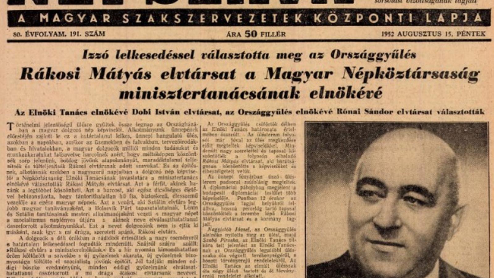 Történelmi, jelentőségű illésre gyűltek össze tegnap az Országházban a magyar dolgozó nép képviselői. Alkotmányunk ünnepének előestéjén zajlott le ez a határtalanul lelkes, ünnepi hangulatú ülés, azokban a napokban, amikor az üzemekben és falvakban, tervezőirodákban és hivatalokban, a magyar dolgozók milliói minden tudásukat és munkaakaratukat latba vetve harcolnak azért, hogy méltóképpen köszöntsék szép jelenünk, boldog jövőnk alapokmányát, maradéktalanul teljesítsék és túlteljesítsék Rákosi elvtársnak adott szavukat. És az építésnek, alkotásnak ezekben a nagyszerű napjaiban a dolgozó népképviselő, a Népköztársaság Elnöki Tanácsának javaslatára a minisztertanács elnökévé választották Rákosi Mátyás elvtársat.
