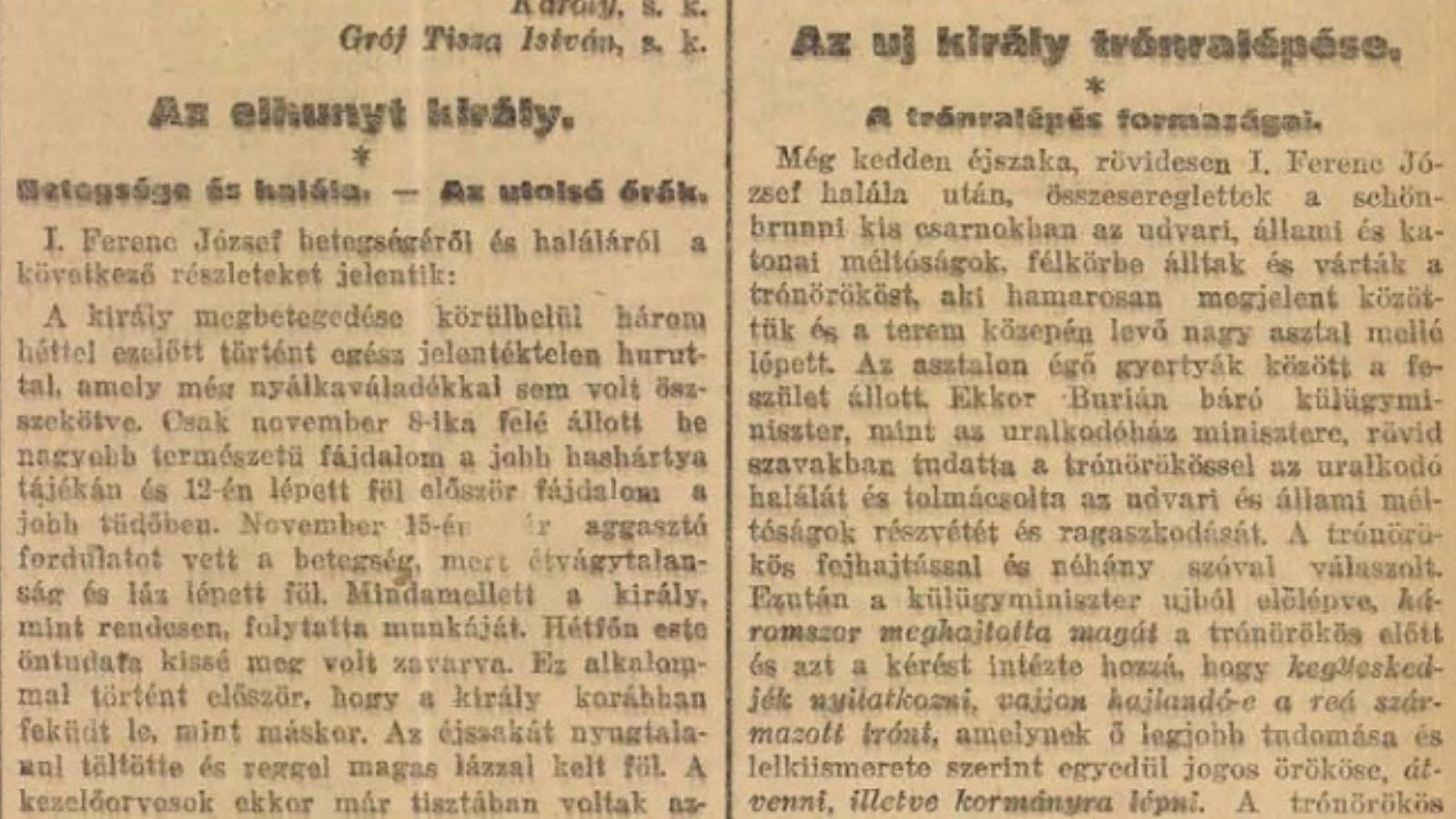 A király 9 óra 5 perckor halálküzdelem nélkül elszenderült. A halottas szobában az összes Bécsben lévő uralkodóházi tagok jelen voltak és a legfelsőbb udvari méltóságokat is bebocsátották. Burián báró külügyminiszter, aki a halálhír vétele után nyomban megjelent a halotti szobában, éjjeli 11 órakor ismét a kastélyba ment, hogy mint a királyi ház minisztere, elintézze a halálfölvétel aktusát.