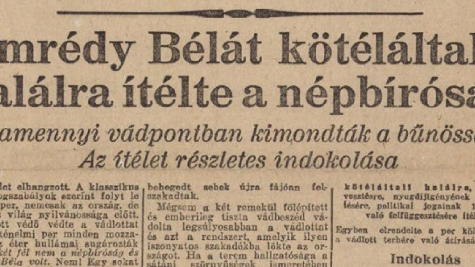 Az ítélet elhangzott. A klasszikus római jogszabályok szerint folyt le a nagy per, nemcsak az ország, de az egész világ nyilvánossága előtt. Választott védő védte a vádlottat és a történelmi per minden mozzanatát az éter hullámai sugározták szét. A két fél nem a népbíróság és Imrédy Béla volt. Nem! Egy sokat szenvedett nép és egy ezeréves múlt bölcsőjéből burjánzott huszonöt esztendős ellenforradalom. A vádlottat — jelen esetben — egy sápadt, a vádak súlyától meggörnyedt, hatalomra vágyó férfit és a hatalomért mindent odadobó személyt, Imrédy Béla testesítette meg.