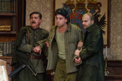 Aztán a memoár többi részét, a részleteket, már a mindössze hetven főt befogadó színházteremben tudjuk meg. Át kell lépdelnünk a piros fehér zöld léggömbökön (Izsák Lili látványvilága). Znamenák bent folytatja. Kis asztal, szék, az asztalon pálinkás üveg, pohárral. És a földön a sok lufi. Az előadás színlapja szinte sokkoló, a piros fehér zöld léggömb madzagja alul egy akasztófa kötelet formáz. Eörsi szövegében is megvan ez a kettősség: a humor és a rémület. A kedélyesség és a halál közelsége. De leginkább az élni akarás, igen nem tévedés, az akasztófa árnyékában is.