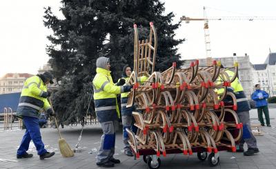 Az Országgyűlés Hivatala munkatársai bontják az ország karácsonyfáját a Kossuth téren 2017. január 9-én. A fenyőfa feldarabolása után a faanyagot rászoruló tűzoltócsaládoknak adják - írja az MTI. ( de miért is vannak rászoruló tűzoltócsaládok Magyarországon? - a szerk.) A kordont képező szánkókat pedig a rendvédelmi szervek hősi halottai gyermekeinek ajánlotta fel az Országgyűlés Hivatala.