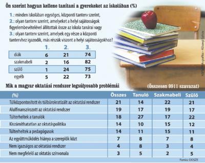 Az oktatás színvonalának alakulását tekintve a tanárok 80 százaléka, a szülők 83 százaléka és a diákok 70 százaléka vélte úgy, hogy romlott a színvonal az elmúlt években - olvasható az Osztályfőnökök Országos Szakmai Egyesülete felmérésének eredményeit összefoglaló jelentésben. A szervezet tavaly novemberben küldte szét kérdőíveit, több mint ötezer választ kaptak. Bár a minta nem reprezentatív, az eredmények szakmai körben nélkülözhetetlenek, hiszen az oktatásért aggódó, abban érintett kritikus népesség véleményét tükrözik.