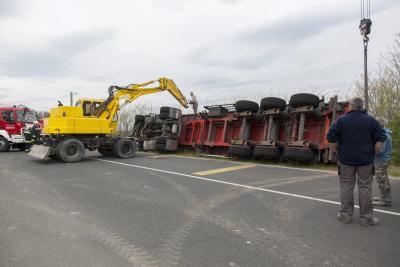 Oldalára dőlt kamion műszaki mentésén dolgoztak tűzoltók és szakemberek Nemeskeresztúr és Jánosháza között. Az építési törmeléket szállító jármű balesetében a sofőr megsérült, az utat a műszaki mentés idejére lezárták.