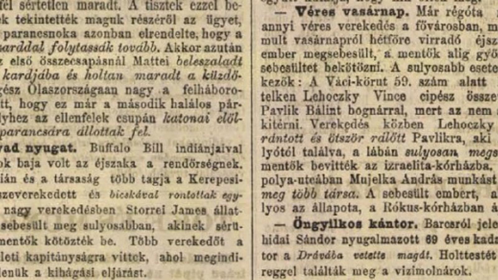 Vad nyugat. Buffalo Bill indiánjaival megint sok baja volt az éjszaka a rendőrségnek. Több indián és a társaság több tagja a Kerepesi-úton összeverekedett és bicskával rontottak egymásra.