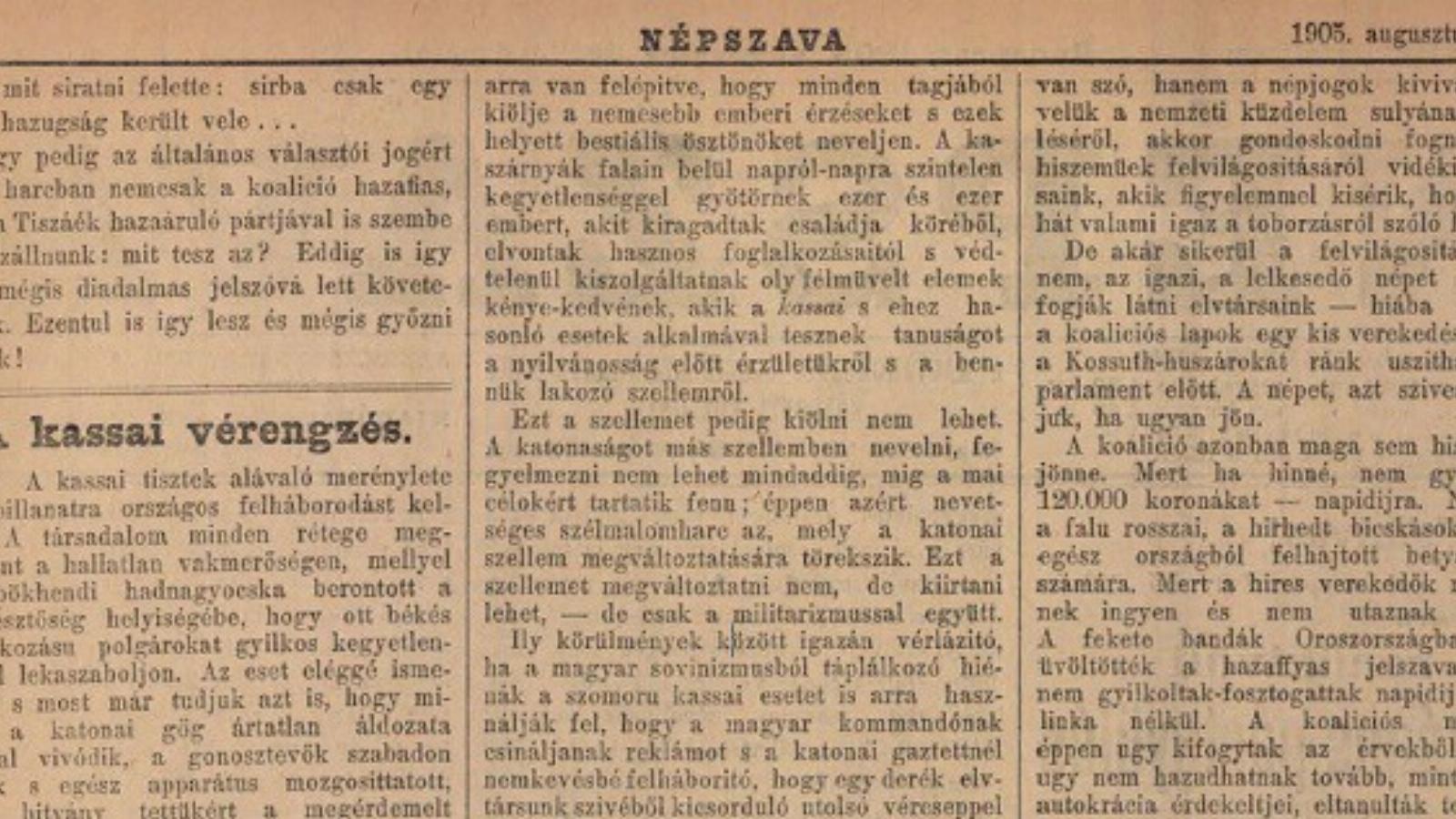 Éjjeli órákban a Magyar Távirati Iroda felháborítóan gyalázatos és hazug jelentést adott ki a kassai katonai banditák gyilkossági kísérletéről. E felsőbb parancsra sugalmazott félhivatalos hazugság bizonyítéka annak, hogy a militarizmus fenevadjai a minden szolgálatra kész nyelvvel akarják az ártatlanul kiontott vért felnyalatni. Szomorú dolog, hogy a sajtónak még ilyen esetben is akadnak olyan banditái, a M. T. I. tudósítói személyében, akik a saját arcukra mért pofonokat és kardvágásokat a meg-rendelt hazudozás katonai recept szerint készült flastromával akarják beragasztani.