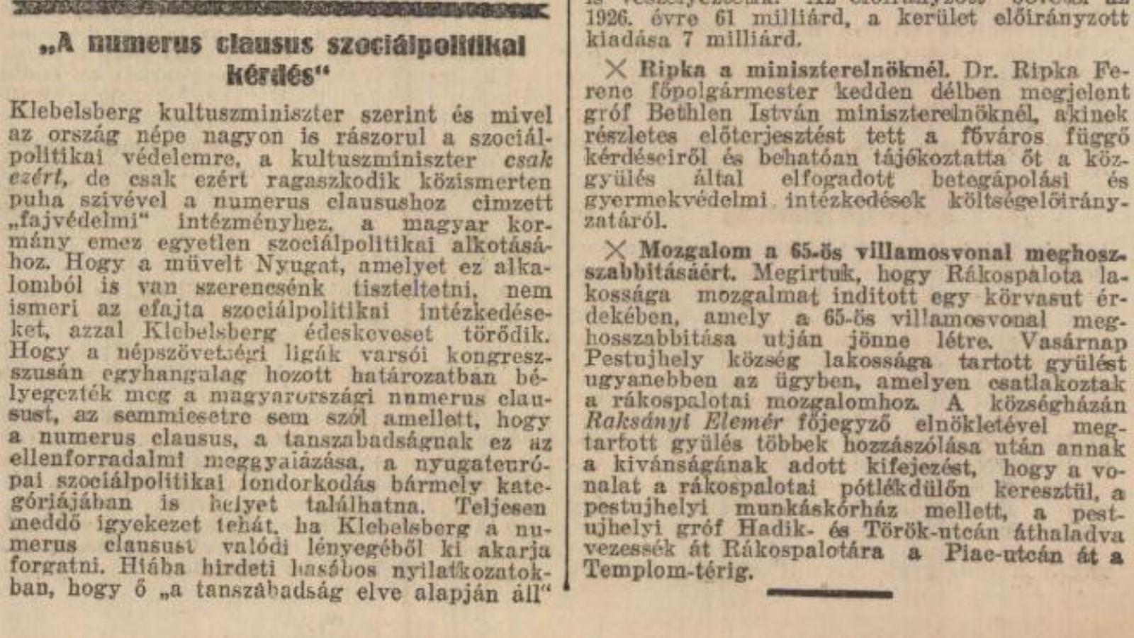 Klebelsberg kultuszminiszter szerint és mivel az ország népe nagyon is rászorul a szociálpolitikai védelemre, a kultuszminiszter csak ezért, de csak ezért ragaszkodik közismerten puha szívével a numerus clausushoz címzett „fajvédelmi" intézményhez, a magyar kormány emez egyetlen szociálpolitikai alkotásához. Hogy a művelt Nyugat, amelyet ez alkalomból is van szerencsénk tiszteltetni, nem ismeri az effajta szociálpolitikai intézkedéseket, azzal Klebelsberg édeskeveset törődik.
