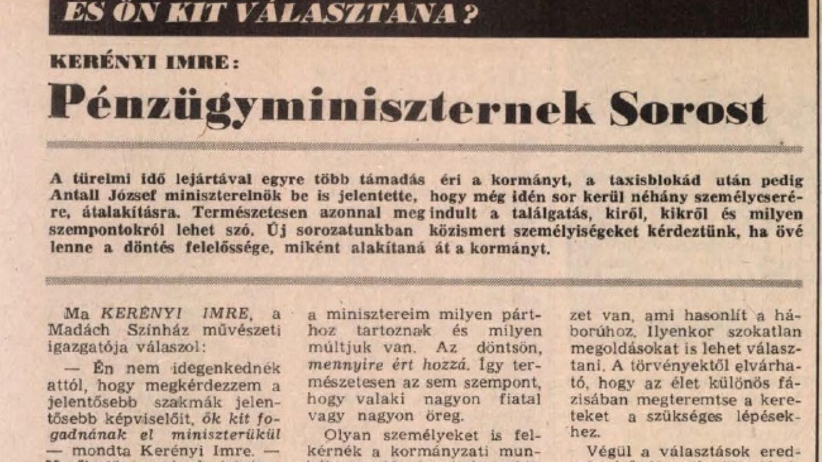 — Én nem idegenkednék attól, hogy megkérdezzem a jelentősebb szakmák jelentősebb képviselőit, ők kit fogadnának el miniszterükül — mondta Kerényi Imre. — Ne ők döntsenek, de jelzéseik mégis sokat segítenének. A minisztertől ugyanis elvárom, hogy azonosuljon területével, és szükség esetén saját kormányával is szembeszálljon érdekében.