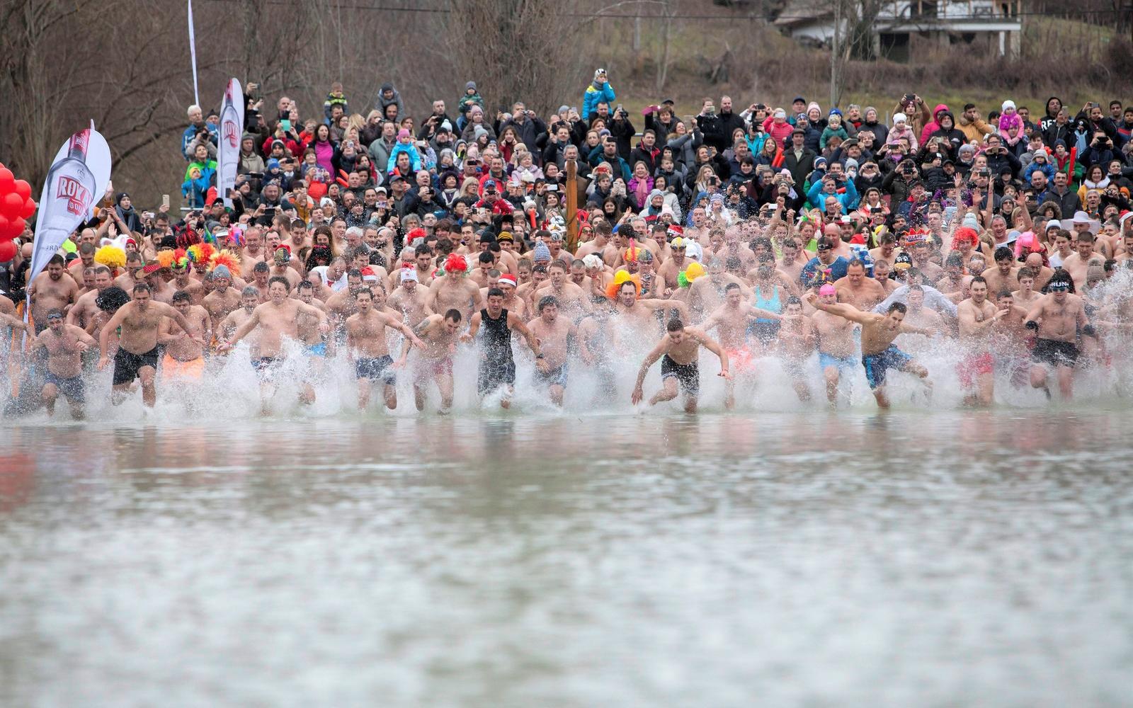 A hetedik alkalommal megrendezett újévi csobbanás résztvevői futnak bele a Balatonba a szigligeti strandon 2018. január 1-jén.