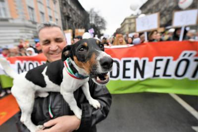 A Magyar Kétfarkú Kutya Párt Békemenete az Oktogontól indult, a Blaha Lujza téren és az Astorián keresztül haladt az Erzsébet térre. Délben mintegy öt-hatszázan voltak a gyülekezőhelyen, de a mellékutcákból folyamatosan érkeztek a csatlakozók. „Nem hagyom, hogy más tegye tönkre az egészségügyet!”„Nem leszünk Bécs!” „Legyen Béke, de csak, ha továbbra is félhetünk” - feliratok alatt gyülekeztek.