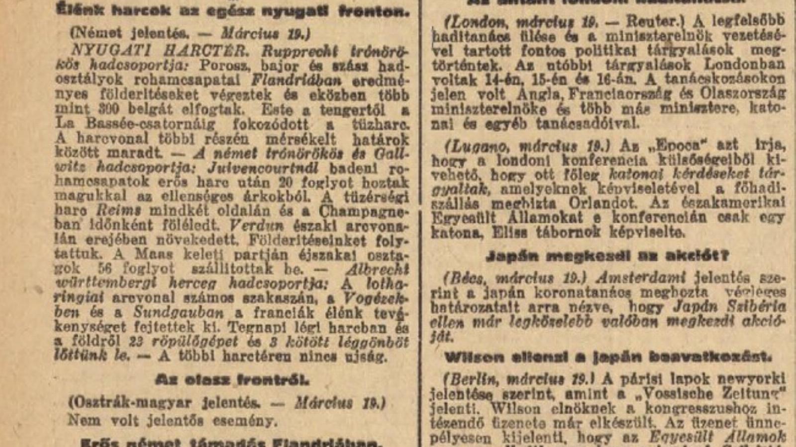 NYUGATI HARCTÉR. Rupprecht trónörökös hadcsoportja: Porosz, bajor és szász hadosztályok rohamcsapatai Flandriában eredményes földerítéseket végeztek és eközben több mint 800 belgát elfogtak. Este a tengertől a La Bassée-csatornáig fokozódott a tűzharc. A harcvonal többi részén mérsékelt határok között maradt — A német trónörökös és Gollwitz hadcsoportja: Juivencourtndlbadeni rohamcsapatok erős harc után 20 foglyot hoztak magukkal az ellenséges árkokból. A tüzérségi harc Reims mindkét oldalán és a Champagne-ban Időnként föléledt. Verdun északi arcvonalán erejében növekedett. Földerítéseinket folytattuk. A Maas keleti partján éjszakai osztagok 58 foglyot szállítottak be.