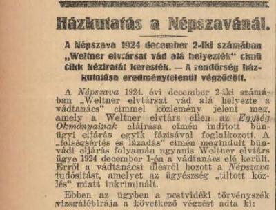 A Népszava 1924. december 24-i számában „Weitner elvtársat vád alá helyezték" című cikk kéziratát keresték. — A rendőrség házkutatása eredménytelenül végződött