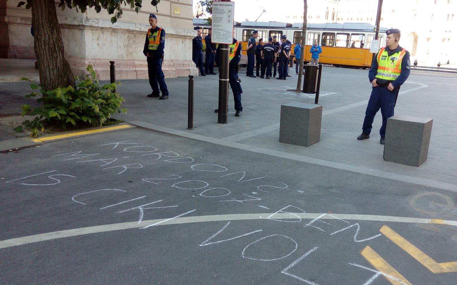 Itt újabb rendőrsorfal alakult ki, a tüntetők a képviselőknek üzenve azt kiabálták, hogy "Gyertek ki!". Munkatársunknak az egyik rendőr azt mondta: azért engedték be az embereket a térre, "mert demokrácia van".