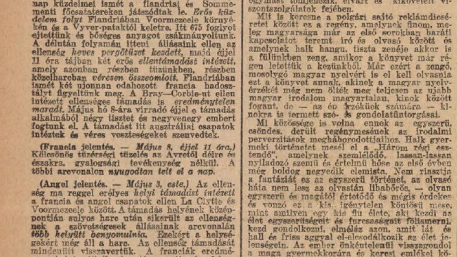(Német jelentés. — Május 9. este.) A tegnapi nap küzdelmei ismét a flandriai és Sornme-menti főcsatatereken játszódtak le. Erős küzdelem folyt Flandriában Voormezeele környékén és a Vyver-pataktól keletre. Itt 675 foglyot ejtettünk és bőséges anyagot zsákmányoltunk. A délután folyamán itteni állásaink ellen az ellenség heves pergőtüzet kezdett, majd éjjel 11 óra tájban két erős ellentámadást intézett, amely azonban részben tüzünkben, részben közelharcban véresen összeomlott. Flandriában Ismét két újonnan odahozott francia hadosztályt figyeltünk meg. A Bray—Corbie-ut ellen intézett ellenségets támadás is eredménytelen maradt. Május hó 8-ára virradó éjjel e támadás alkalmából négy tisztet és negyvenegy embert fogtunk el. A támadást itt ausztráliai csapatok intézték és véres veszteségeket szenvedtek.
