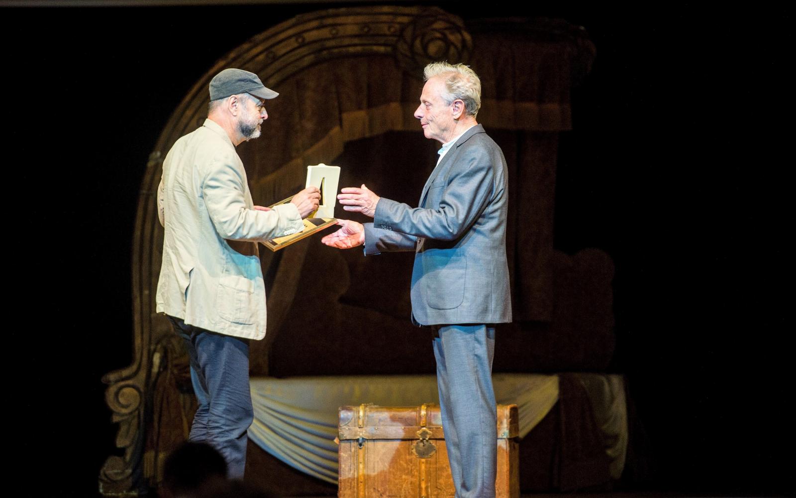 Tompa Gábor, a Kolozsvári Állami Magyar Színház igazgatója átveszi az Ibsen Rosmersholm című darabjáért odaítélt legjobb előadásnak ítélt díjat Bálint András Kossuth- és Jászai Mari-díjas színésztől MTI Fotó: Sóki Tamás