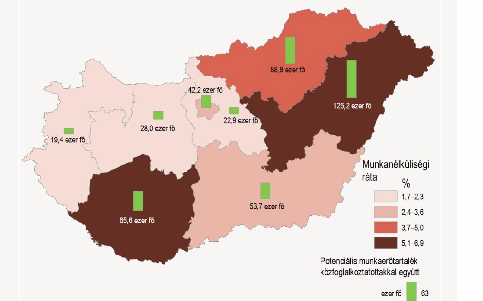 Jól mutatja ezt a KSH Munkaerőpiaci folyamatok című kiadványában közölt térkép, amelyen együttesen jelölték a potenciális munkaerő-tartaléknak tekintett munkanélkülieket, alulfoglalkoztatottakat, dolgozni szándékozó, de munkát aktívan nem keresőket, inaktívakat és meglepő módon a máskor a foglalkoztatottak közé sorolt közmunkásokat. Az ábra alapján a lehetséges munkaerőpiaci utánpótlás éppen ott van, ahol a legnagyobb a munkanélküliség is. Az Észak-Alföldön több mint 125 ezren vannak, miközben itt a legmagasabb, 5,1-6,9 százalékos a munkanélküliség. Hasonló munkanélküliségi ráta jellemző a Dél-Dunántúlra is, ahol több mint 65 ezer főre teszik a munkaerőpiaci utánpótlás létszámát. Ehhez képest Nyugat-Dunántúlon alig 20 ezer a még munkába bevonhatók létszáma, a munkanélküliségi ráta pedig 2 százalék alatt van.